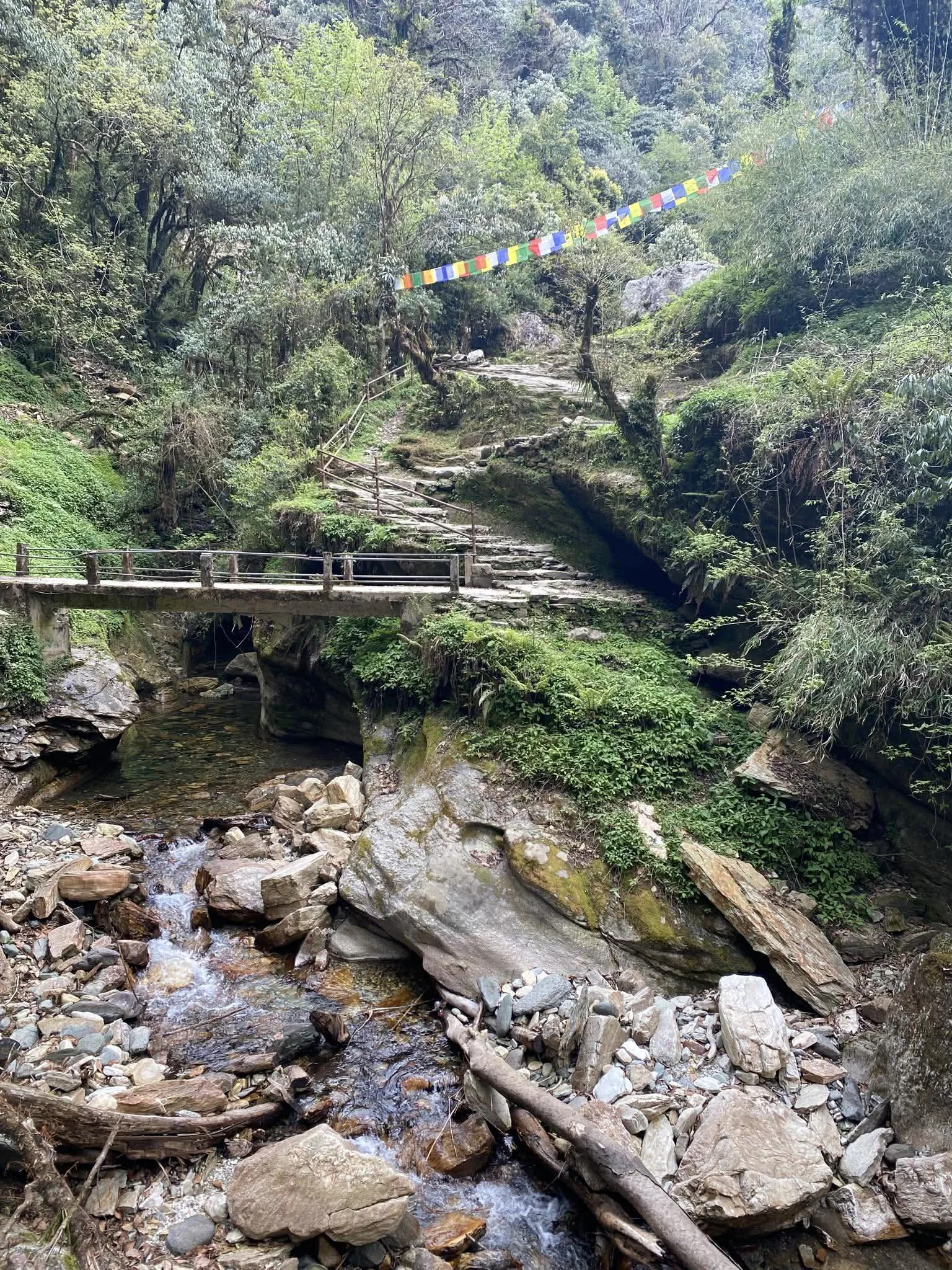 The scenery is classic Annapurna. We walk through terraced fields and beautiful rhododendron and oak forests, with stone stairways winding beneath tall trees and occasional clearings that open to Machhapuchhre, Annapurna South, and Dhaulagiri. From Ghorepani, an early pre‑dawn start takes us up to Poon Hill for sunrise—often a highlight of the trip—with a sweeping panorama of 8,000‑meter peaks glowing pink and gold as the day begins. After breakfast, we continue along ridgelines and descents through forest and village paths to Ghandruk, a historic Gurung village known for its traditional houses, flagstoned lanes, and welcoming teahouses.